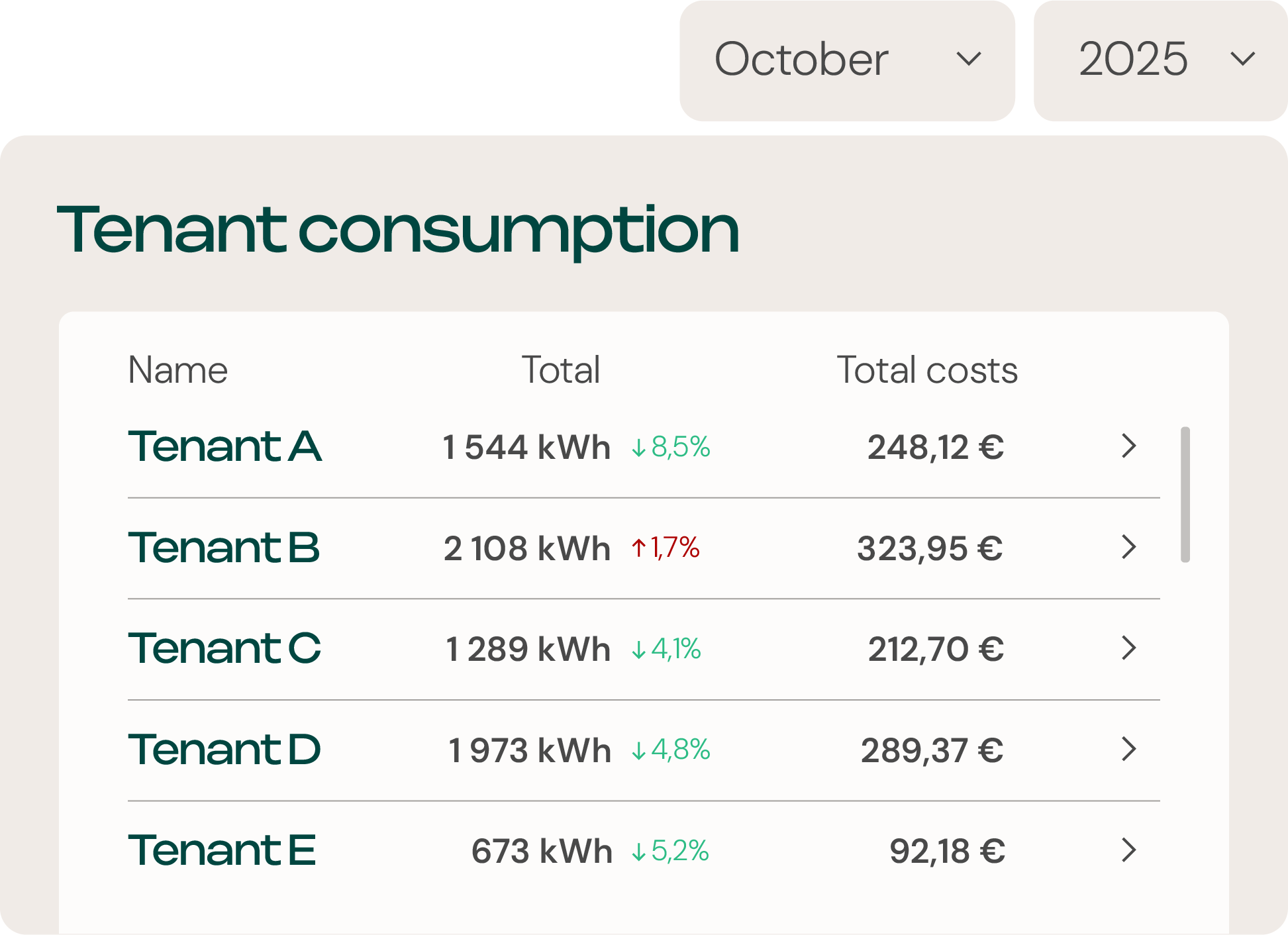 Die Berichte enthalten alles vom Stromverbrauch in kWh über die Kosten bis hin zum tatsächlichen CO2-Fußabdruck in CO2e, so dass Sie Ihren Mietern mehr bieten können.